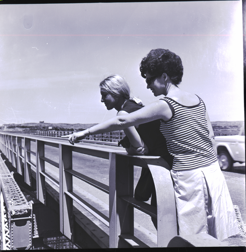 From left to right, Helga Bauer and Norma Herzinger look over the railing of the Perrine Memorial Bridge. Helga Bauer is a visitor from Germany taking a tour of the area. Mrs. Herzinger points out something in the canyon to the guest. A car is parked to the side. In the background, dirt and sagebrush stretches out into the distance.