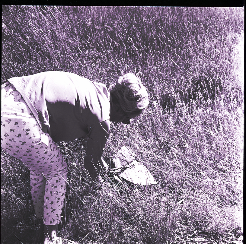 A woman picks wild asparagus in a field of tall grass. She is dressed in a blouse, floral-print pants, and low heels.