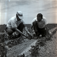 Donald Youtz, Twin Falls County agent, left, and Marshal LeBaron, superintendent of the Twin Falls branch of the University of Idaho Experiment Station, right, check wind damage to beans in a field. The leafy tops of the bean plants in the field stretch into the background.