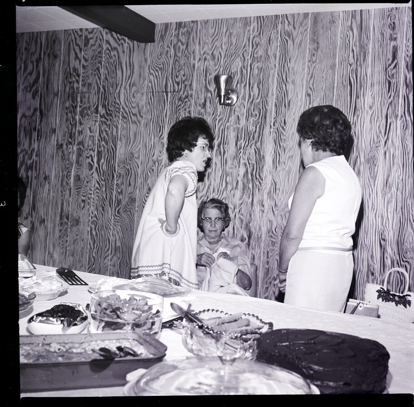 Three members of the Twin Falls County Democratic Women visit at a potluck luncheon held in honor of Mrs. R. L. Summerfield at the home of Tommy Walker. On the table behind them are various dishes of food, a chocolate cake, and a pie. In the center of the table is a goblet filled with water and floating flowers. In the corner beside the women are some purses. A lamp hangs on the wall above them.