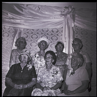 - A group of women dressed in dresses and corsages pose at the Canyonside Community Club Golden Anniversary social in Jerome at the Carillon. A drape hangs on the wall behind them.