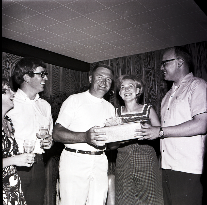 - A man hands Mr. and Mrs. Horney a wrapped present at their farewell party held at the home of Tommy Walker. A couple holding drinks stand to the right, laughing.