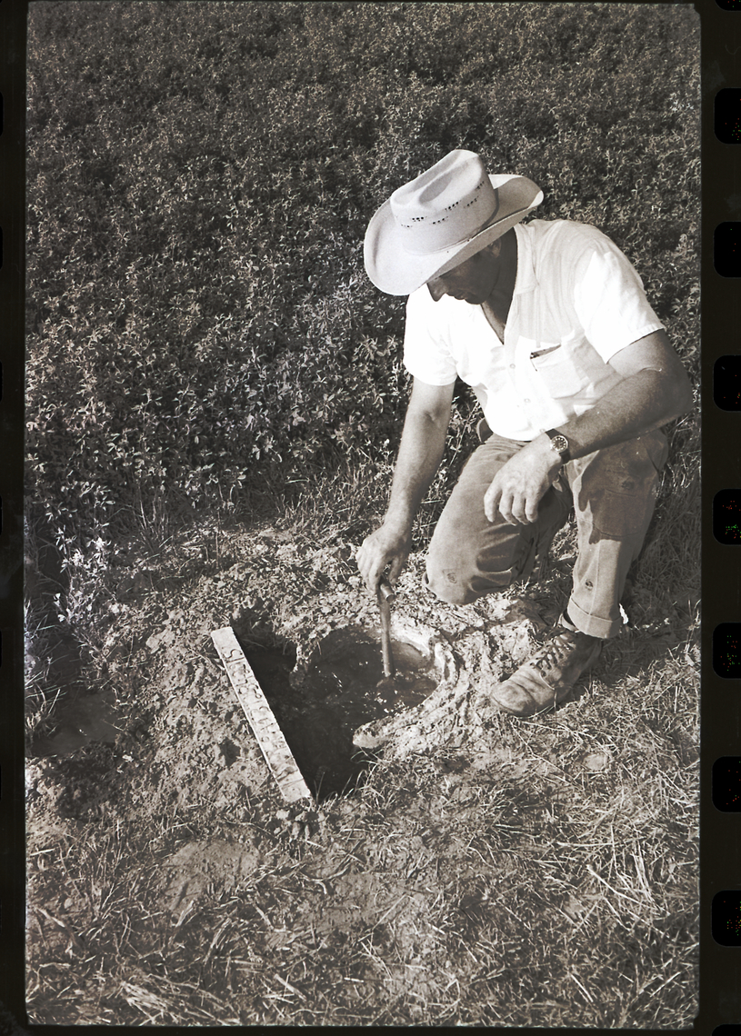 - A farmer inspects a pump hole filled with water that is part of a new irrigation system for a field near Jerome. He is dressed in a wide-brimmed hat. The crop field stretches out into the distance behind him.