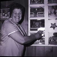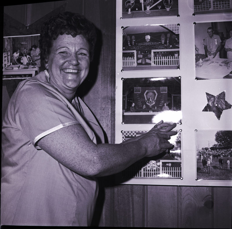 Mrs. Don Albin stands beside a poster in an office displaying photographs of different booths at the Twin Falls County Fair. She creates unusual and attractive decorations for fair-related events.