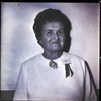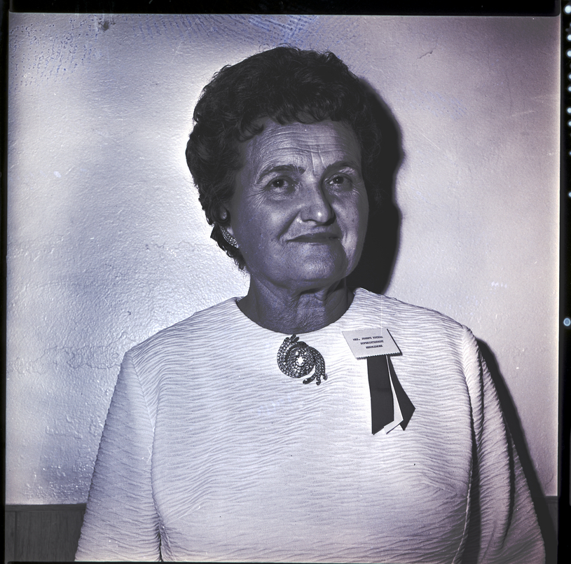 Mrs. Joseph Kucera, superintendent of needlework for the Twin Falls County Fair, stands beside a wall. She is wearing a blouse with a name tag and a pin pinned onto the neck.
