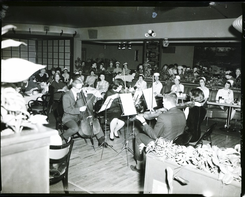 A string quartet plays "String Quartet No. 6" by Verrall for a crowd of people at the Twin Falls Federated Music Club's 14th annual White breakfast. On the left, Barry Hamilton plays a cello and Nancy Schow plays a violin. On the right David Hamilton and Kathy Holm play violins. Sitting in the background are past club presidents dressed in white dresses and hats with white rose corsages.