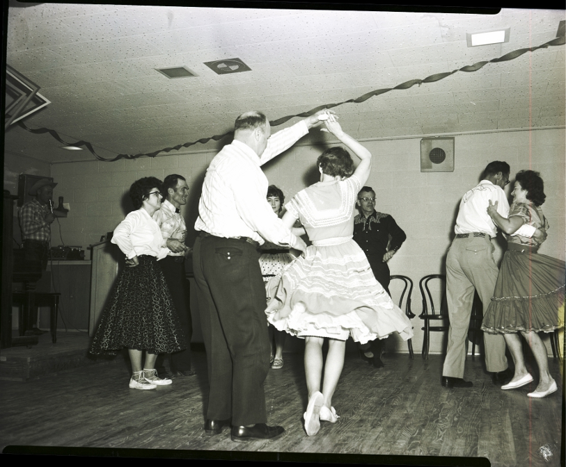 Dancing at a practice square dance session held at the Bairdatorium are Mr. and Mrs. Fred Shobe, foreground. In the background from left to right are Mrs. Joe Gibbs, Manley Hansen, Mrs. Larry Sabin, Larry Sabin, and Mr. and Mrs. Pat Warren. The women are dressed in full skirts. The caller, Bill Cofield, dressed in a cowboy hat and plaid shirt, is seen holding a microphone in the background. Streamers decorate the ceiling.
