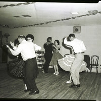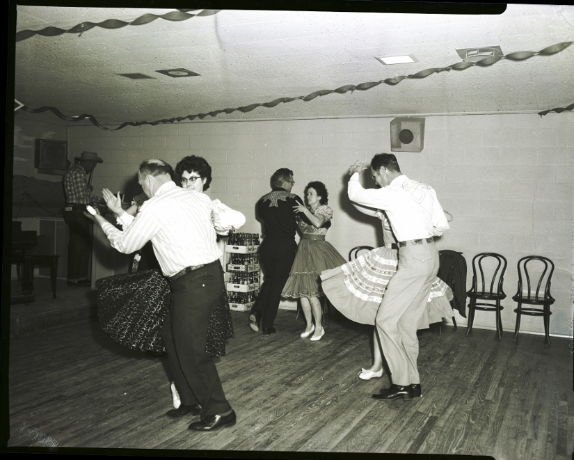 Dancing at a practice square dance session held at the Bairdatorium are from left to right Fred Shobe and Mrs. Joe Gibbs, Larry Sabin and Mrs. Pat Warren, and Mrs. Fred Shobe and Pat Warren. The women are dressed in full skirts. The caller, Bill Cofield, dressed in a cowboy hat and plaid shirt, is seen holding a microphone in the background. Streamers decorate the ceiling.