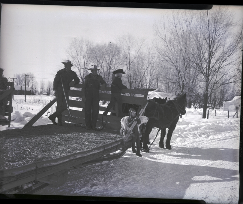 A hay wagon mounted on skis is hitched to two horses. A child in a coat and a cowboy hat, Mike Robinson, holds the reins. Another child in a hooded coat, Holly Robinson, sits off the side of the hay wagon and hangs to a brace. A dog stands behind her. The father, Bruce Robinson, and another man, both dressed in coats and cowboy hats, stand on the back of the hay wagon. Hay covers the bottom of the wagon, and one of the men is holding a pitchfork. Snow covers the ground. A house with a roof covered in snow, barren fields, and bare trees are seen in the background.