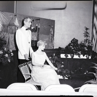Decorations for the BPOE Ladies of the Elks Sweetheart Ball are on display. A woman mannequin in a dress and tiara sits on a bench, while a man mannequin in a tuxedo stands behind her. A backdrop of a painted castle is in the background. Several plants and flowers are placed around the scene.