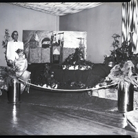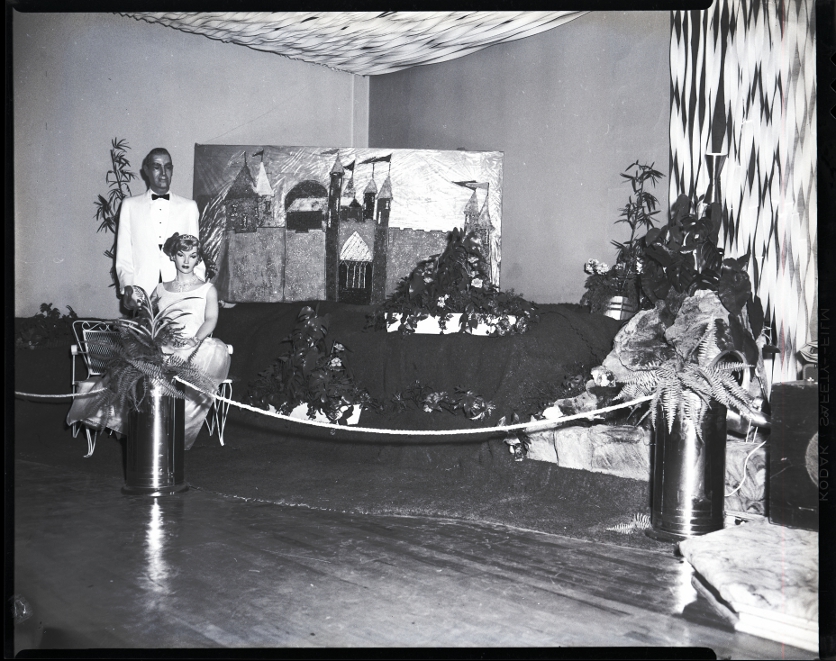 Decorations for the BPOE Ladies of the Elks Sweetheart Ball are on display. A woman mannequin in a dress and tiara sits on a bench, while a man mannequin in a tuxedo stands behind her. A backdrop of a painted castle is in the background. Several plants and flowers are placed around the scene. Streamers hang from the ceiling and walls.