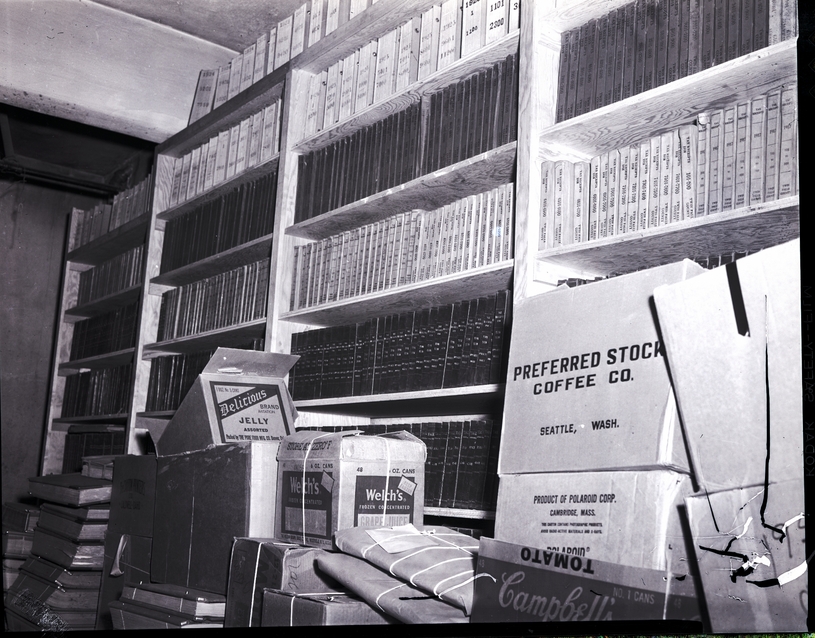A storage room in the Twin Falls county court house is crowded with bookshelves filled with books, piles of books on the floor, and stacks of boxes filled with records. The microfilming of records with the new microfilm camera will save space in the office and enable the courthouse to keep more accurate and secure records.
