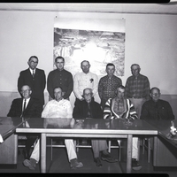 - Ten men, members of the Twin Falls Cattlemen Association, gather around a table. C. W Daigh, Don Ramseyer, and Tom Callen are in attendance. Some papers and ashtrays are on the table. A large photograph of Shoshone Falls hangs on the wall behind them.
