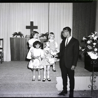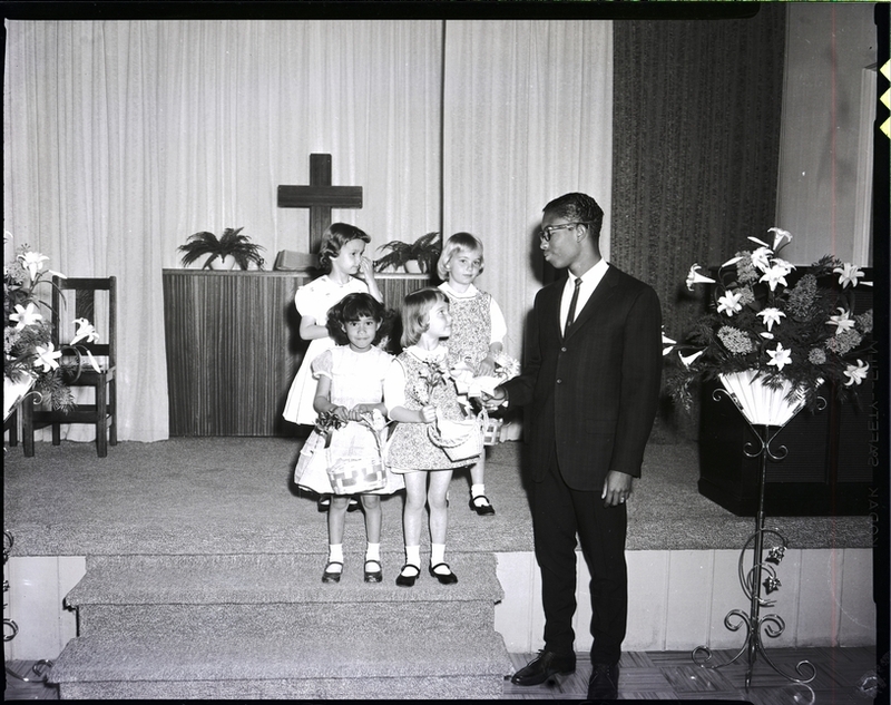 From left to right, Doralee Welch, Judy Stepanovich, Anita Hernandez, and Jody Stepanovich carry May baskets for offering at the United Church Women's May Fellowship luncheon at the Church of the Brethren. The little girls are all wearing dresses. An African American man, Bob Nora, dressed in a suit and tie holds the handle of one of the baskets. Flower pots filled with lilies decorate the sides of the stage. A display with a cross is in the background.