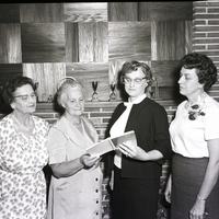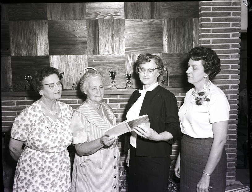 Four woman look at a spiral notebook at the Junior Music Club Gold Cup recital and social hour. Behind them is a fireplace mantel decorated with several trophies. The notebook reads "God's Voice" on the front. The woman wear dresses, and one has a corsage.