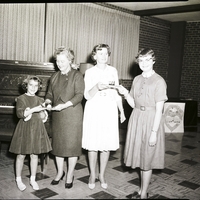 - An elderly woman and a little girl hold a saucer and tea cup at the Junior Music Club Gold Cup recital and social hour. Beside them a woman and a teenage girl also hold a saucer and tea cup. A piano and a poster with some music notes are in the background.