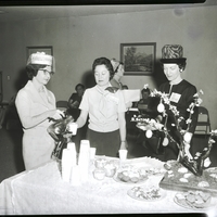 Serving coffee at the South Central District Home Demonstration Council get-acquainted coffee hour is Mrs. Wesley Sonius, left, member of the Merry Marrieds Club, to Mrs. Robert Moldenhauer, center, president of Town and Country Club, and Mrs. Loren Anderson, secretary and treasurer of the Town and Country Club. The Merry Marrieds club members and Homebuilders club members were hostesses for the coffee hour. The three women are wearing dresses, and Mrs. Sonius and Mrs. Anderson are wearing hats. The table has a small flowering tree decoration and plates of cookies, cups, and napkins. Some people can be seen seated in folding chairs below a painting hanging on the wall in the background.