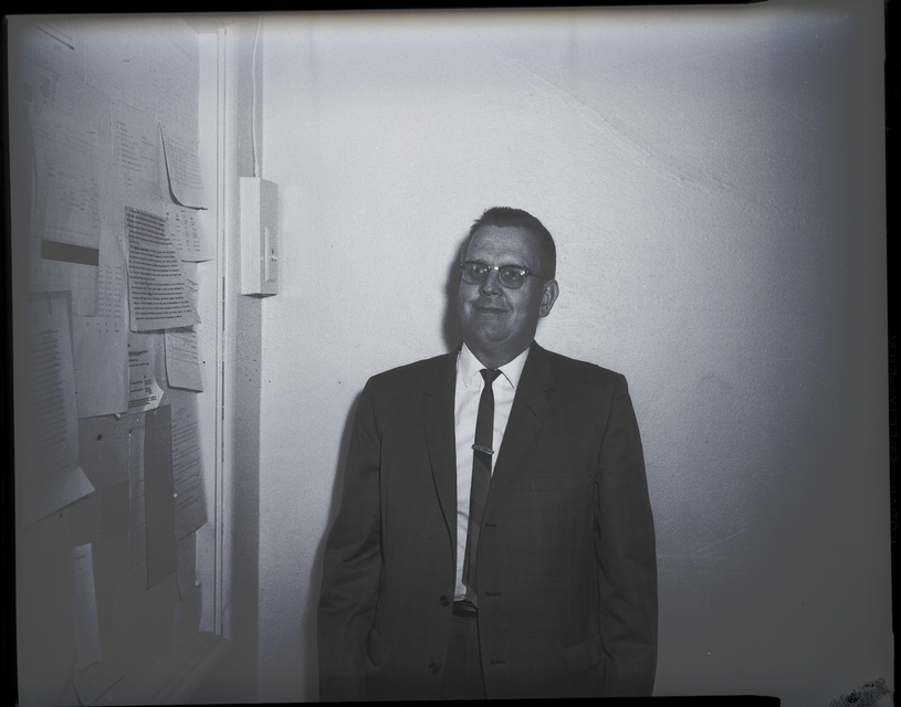 - Lund Christensen, dressed in a suit and tie, stands in the corner of a room. On the wall beside him is a light switch and a bulletin board filled with papers.