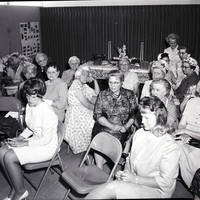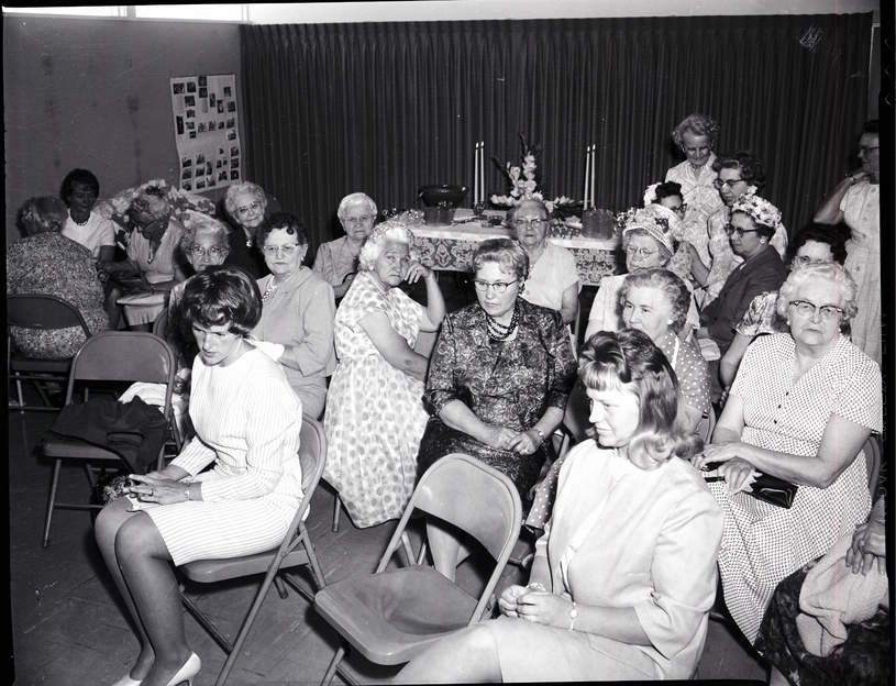 A group of women are gathered at the Morningside Club Fiftieth Anniversary, sitting on folding chairs. They are all wearing dresses, and a few have hats. In the background is a refreshment table covered in a lacy table cloth. On the table is a a platter of cookies, a punch bowl, plates, cups, silverware, a tea set, a centerpiece of flowers, and candles.