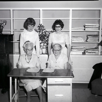 Representing the oldest and the youngest members of the Morningside Club are, standing from left to right, Mrs. Will Gurski and Mrs. Farrell Peterson, and seated from left to right, Mrs. Vera Holland and Mrs. Frances Osborn. They are all wearing dresses. On the table in front of them are secretaries' books containing the minutes of the meetings for the past 50 years. In the background are some book cases, a piano, some vases of flowers, a document stand, an a woman sitting on a couch.