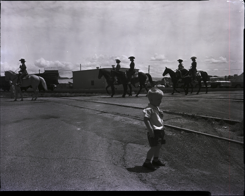 Jeffrey Leazer, two-year-old son of Mr. and Mrs. Richard Leazer, stands beside some railroad tracks at the Magic Valley Western Horse Show Parade. Five women in cowboy hats and boots ride horses in the background. A train, a woman, and some buildings and automobiles (cars) are in the background.