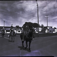 A procession of women on horses, dressed in cowboy hats and boots, ride down a street in the Magic Valley Western Horse Show Parade. 2nd Ave S. intersects behind the riders. The Blue Top Cafe and Blue Top Lounge are seen on the corner behind a one-way sign and stop sign. Behind it signs for The Blue Top Beer and City Floral are visible. Down the street is a large billboard reading "Falls Brand Skinless Wieners, Processed in Idaho for Idaho People, Independent Meat Co." A cafe, auto shop, and building with "A & B Plumbing and Heating" painted on the side are in the background. Several automobiles (cars) are seen on the street.