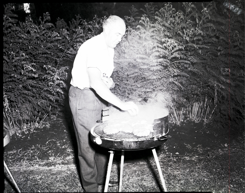 - C. P. Parrish cooks steaks on a barbecue at Dierkes Lake at a Supper Club barbecue. Several trees and bushes surround the area.