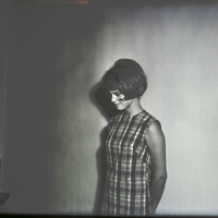 - Marnie Kreilkamp, dressed in a striped dress, shows off her short bob hairstyle from a profile view. A chair is visible in the background.