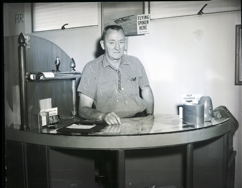 Ken Roundy, president of the Twin Falls Motel association and owner of the Deluxe Motor Lodge, supports a water bond for the growth of Twin Falls. He stands behind a desk, and on the desk is a clipboard with a registration form, an ashtray, a "Ring Bell for Service" sign, and a can with a sign above it that says "Help Yourself." Behind him a picture of an airplane hangs on the wall, and a sign beside it reads "Flying Spoken Here."