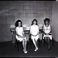 - From left to right, Miss Twin Falls pageant candidates Judy Clark, Marilynn Rappleye, and Pamela Jones sit in chairs in front of a table. A telephone sits on the table. They are all wearing dresses.