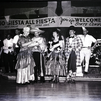 Winners for a craziest costume contest receive their awards at a BPOE convention held in Twin Falls. Mr. and Mrs. Charles Engalls of Boise, winners of the best dressed couple award, are dressed in Spanish clothing, and Charles Engalls wears a large sombrero. Beside them are the winners of the best dressed individual awards, Mrs. Arthur Swanson, dressed in a fancy ruffled dress, and Frank Hike, dressed in a checkered coat with a bow tie and bowler hat. A man in a pointed hat and a group of people stand behind them on the stage. A large banner hanging over the stage reads "No Siesta All Fiesta, Twin Falls, June 1965" and "You're welcomed to the state convention." A podium on stage reads "Twin Falls Lodge B.P.O.E. No 1182" around the Elks Club seal.