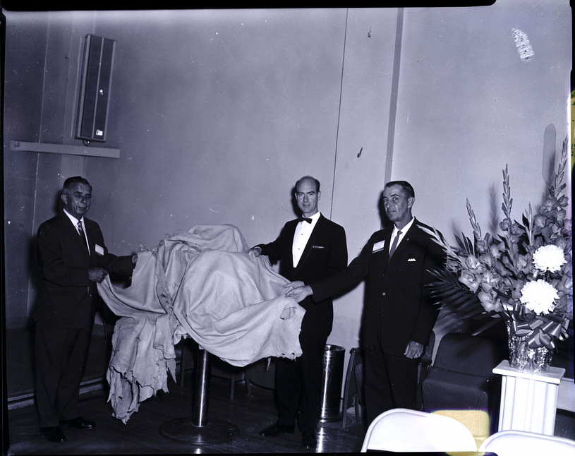 patients at the center. Chester Stahl and Art Swanson are dressed in suits and ties, and Dick Williams wears a suit and bow tie. Some chairs and an ashtray are along the wall behind them. In the corner, a bouquet of flowers sits on a pedestal. A few folding chairs are in the foreground.