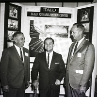From left to right, Chet Stahl, chairman of the hospital board, DeLoy Giles, patient of the Elks Rehabilitation Center, and Weldon Haskins, Elks state president, stand in front of a display for the Idaho Elks Rehabilitation Center at a BPOE convention held in Twin Falls. The men are dressed in suits and ties, and Mr. Giles holds a cane. Mr. Giles, who lived at the Elks Rehabilitation Center in Boise on and off for fifteen years after being almost completely paralyzed in a logging accident when he