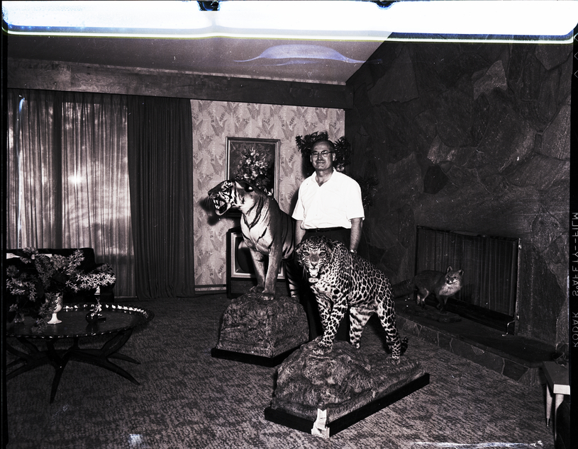 Edward F. Pedersen stands beside a tiger and a leopard he acquired on a hunting safari in Nagpur, India. In front of the fireplace behind him is a stuffed fox. To the side is a coffee table that has a vase of flowers on it. In the background is a couch, a large window covered in drapes, a television, a potted tree, and a painting of a vase of flowers hanging on the wall.