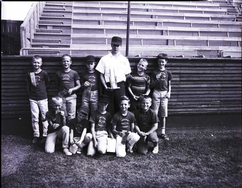 The Speedsters Knothole baseball team, sponsored by Farm and City, pose together in a baseball field at Harmon Park. From left to right standing, are Dennis Hubbell, Carl Schrank, Bob Williams, Coach Dave Gibbons, Bunchy Lewis, and Noel Briggs, and from left to right kneeling are Kevin Packard, Kenny Stewart, Kerry Requia, Gary Stuart and Dave Nye. The young boys are wearing baseball caps and t-shirts that read "Times-News Knothole Baseball" and are holding award ribbons. A man holding a trophy stands with them. Bleachers are in the background behind them.
