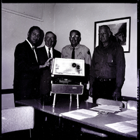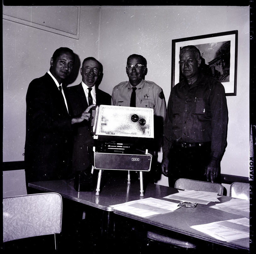 Standing behind a new DEK Photo Recorder are from left to right, Christ Rouseff, president of the DEK Processing Company; E. R. Hopper, commissioner at the Department of Law Enforcement; Sheriff Theo Johnson, Minidoka County; and Sheriff James Benham, Twin Falls County. The photo recorders were demonstrated to about thirty representatives of driver license bureaus of nine counties at the American Legion Hall in Twin Falls. Christ Rouseff and E. R. Hopper are dressed in suits and ties while the sheriffs wear their uniforms. The camera is on a desk, and beside it are papers and an ashtray. Chairs surround the desk. A painting hangs on the back wall.