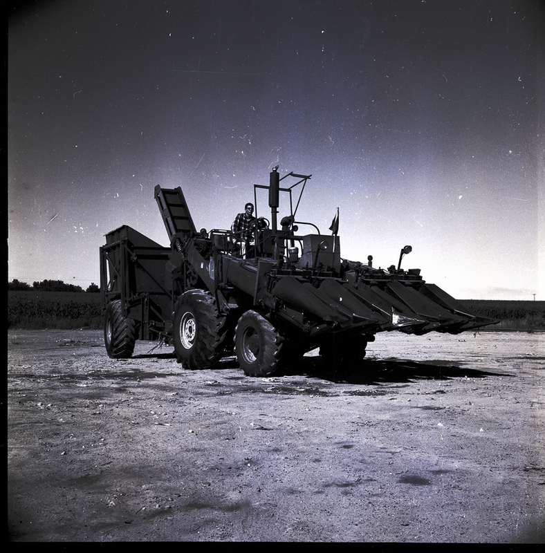 A man in a plaid shirt and sunglasses sits on top of a four-row corn picker that is used by the Green Giant Company in Buhl. The new corn picker is designed for 30-inch corn rows. Joe P. Fehrenbacher, agricultural superintendent of the company, said that 30-inch corn rows are being tried experimentally by the company in the hopes of gaining increased water utilization. A field of corn crops is behind him. Some trees are visible far in the background, on the horizon.