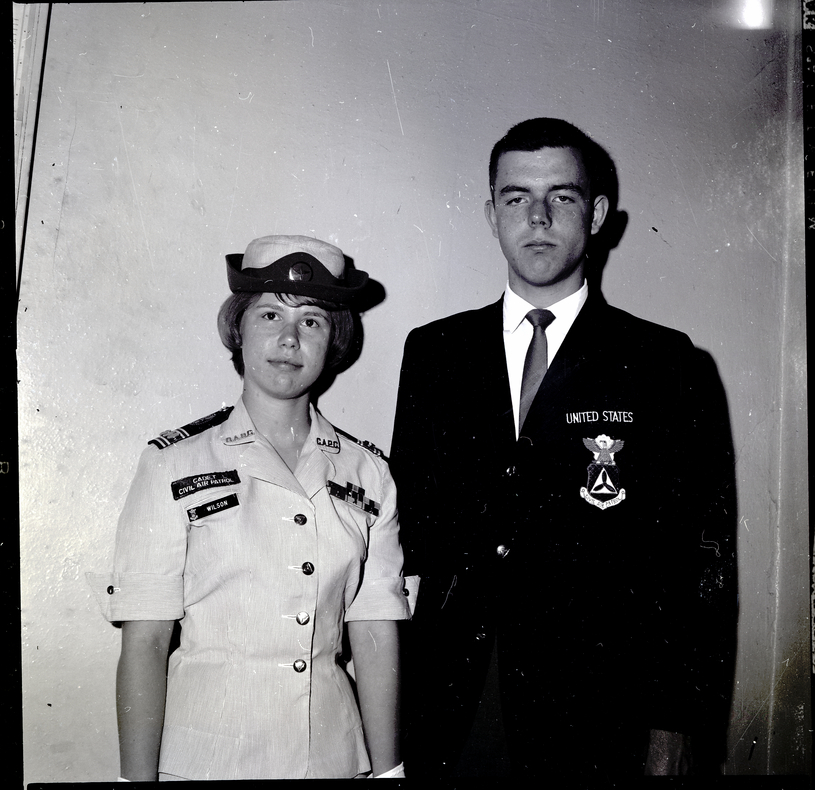 Linda Wilson and Fredrick Coggburn had the opportunity of making extensive tours of the Southwest and Great Britain, sponsored by the special activities program of the Civil Air Patrol. Both are seniors at Twin Falls High School. They are dressed in their CAP uniforms. Linda Wilson is wearing tags that read "Cadet Civil Air Patrol" and "Wilson." Fredrick Coggburn is wearing a jacket that has "United States Civil Air Patrol" embroidered on it.