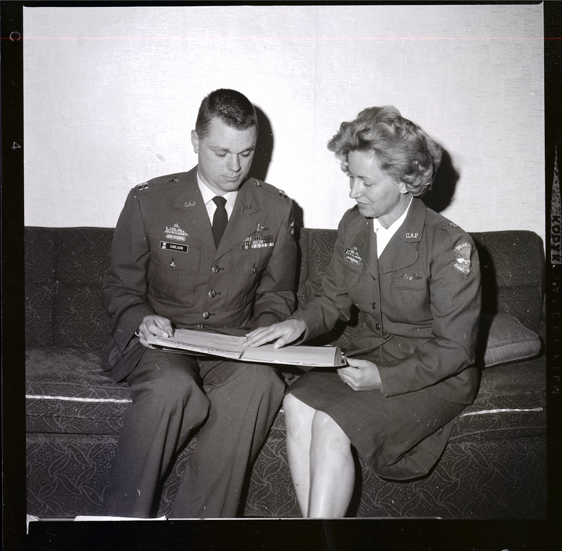 CAP Captain Susan Shaw and Captain Clyde N. Carlson sit on a couch and look over a manila folder of plans for special activities. Capt. Shaw is Idaho Wing Information officer for the CAP and Capt. Carlson is deputy for training of the wing. Together they arrange the international and inter-regional tours awarded to outstanding cadets. They are dressed in their Civil Air Patrol uniforms. Capt. Shaw is wearing tags that read "Civil Air Patrol Idaho" and "USA Auxiliary Civil Air Patrol." Capt. Carlson is wearing tags that read "USA Auxiliary Civil Air Patrol" and "Carlson."