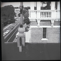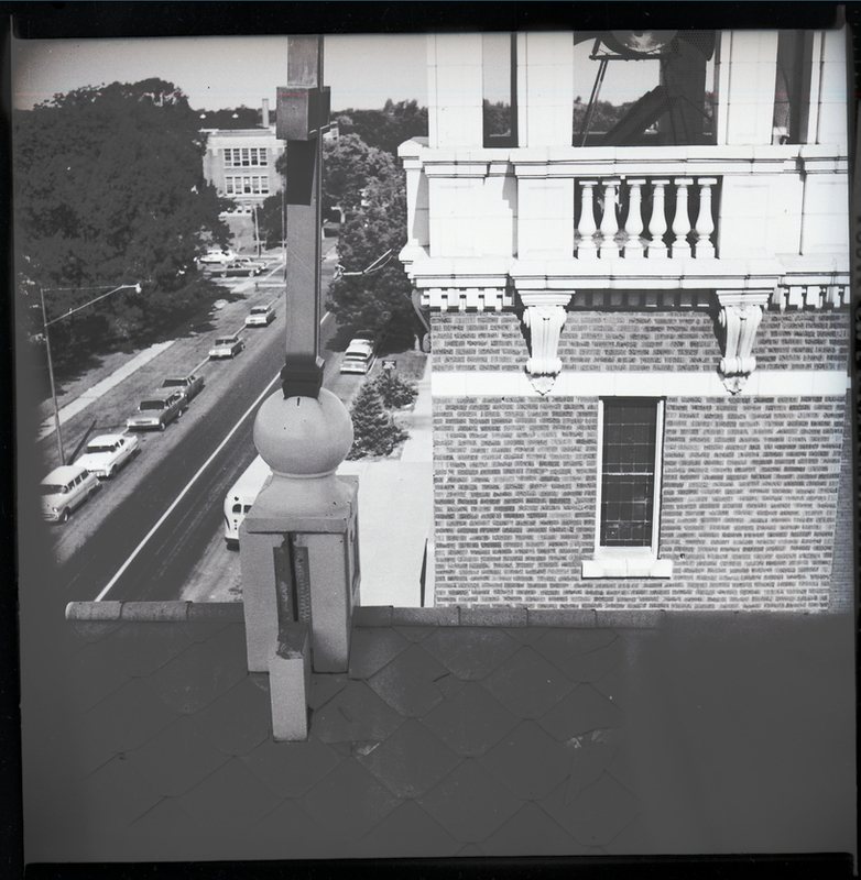 The cross on top of St. Edward's Catholic Church is seen close-up before being removed after the church custodian, George Miller, discovered the base of the cross was coming apart and the cross was loose. A bell tower is seen beyond it. On the ground below, automobiles (cars) travel down the street, and some trees from Twin Falls City Park are visible. Shoshone St. is in the background.