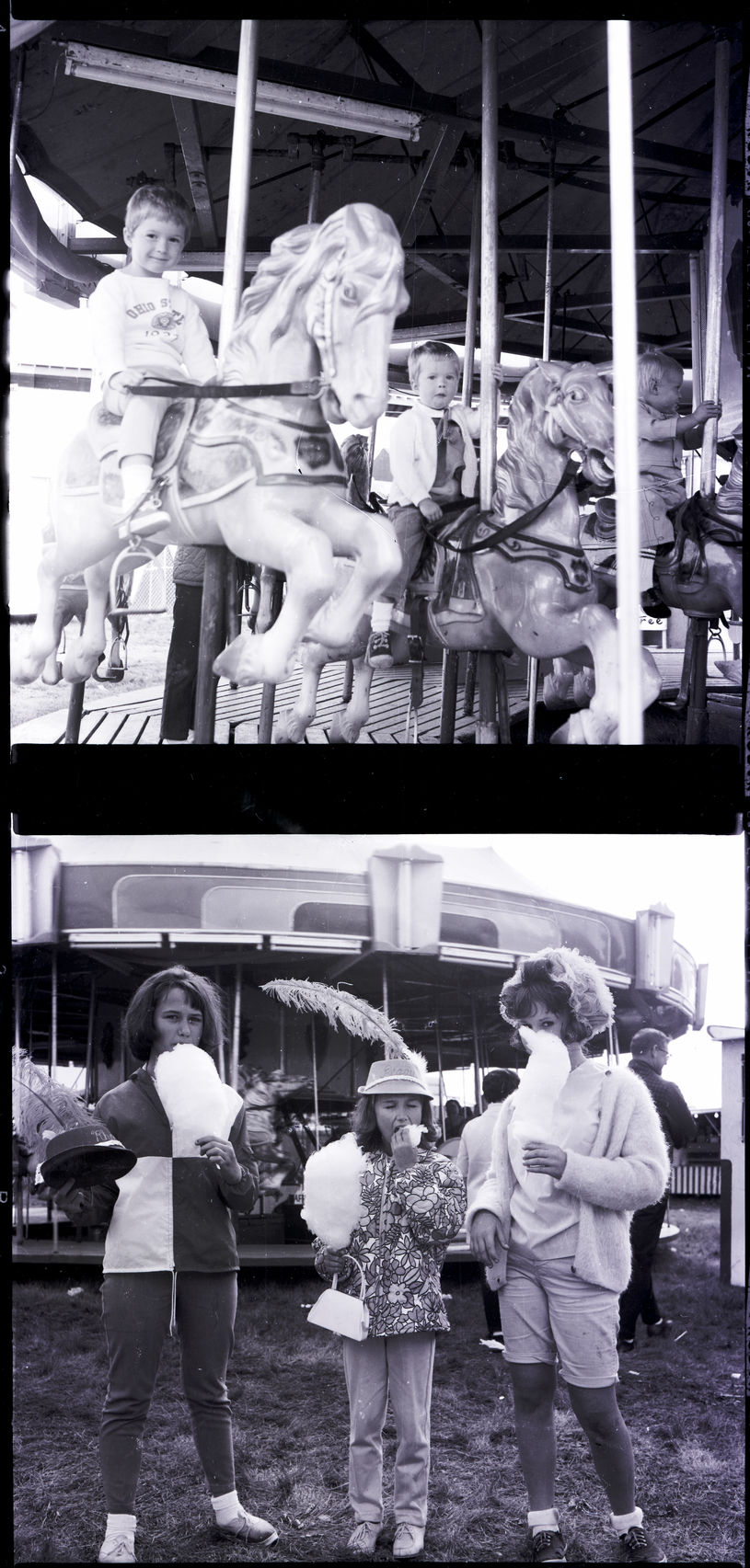 In the top image, from left to right, Becky Johnston, Betty Johnston, and Jana Roesler ride the carousel at the Twin Falls County Fair. In the bottom image, three girls stand in front of the carousel, eating cotton candy. Two of them are wearing embroidered hats with a long feather sticking out of them, and the other girl has rollers in her hair and is wearing a bonnet over them. The center girl has "Peggy" embroidered on her hat, and she's holding a small purse.
