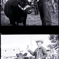 Glenn Shoemaker, member of Future Livestock Club, shows off his grand champion first place winner in the senior division beef fitting and showing at the Twin Falls County Fair. He is wearing a jacket and a cowboy hat, and holding his trophy. His winning cow stands beside him. Some people are sitting on the bleachers behind him. Other men in cowboy hats are holding their cows by bridles in the background.