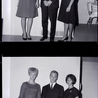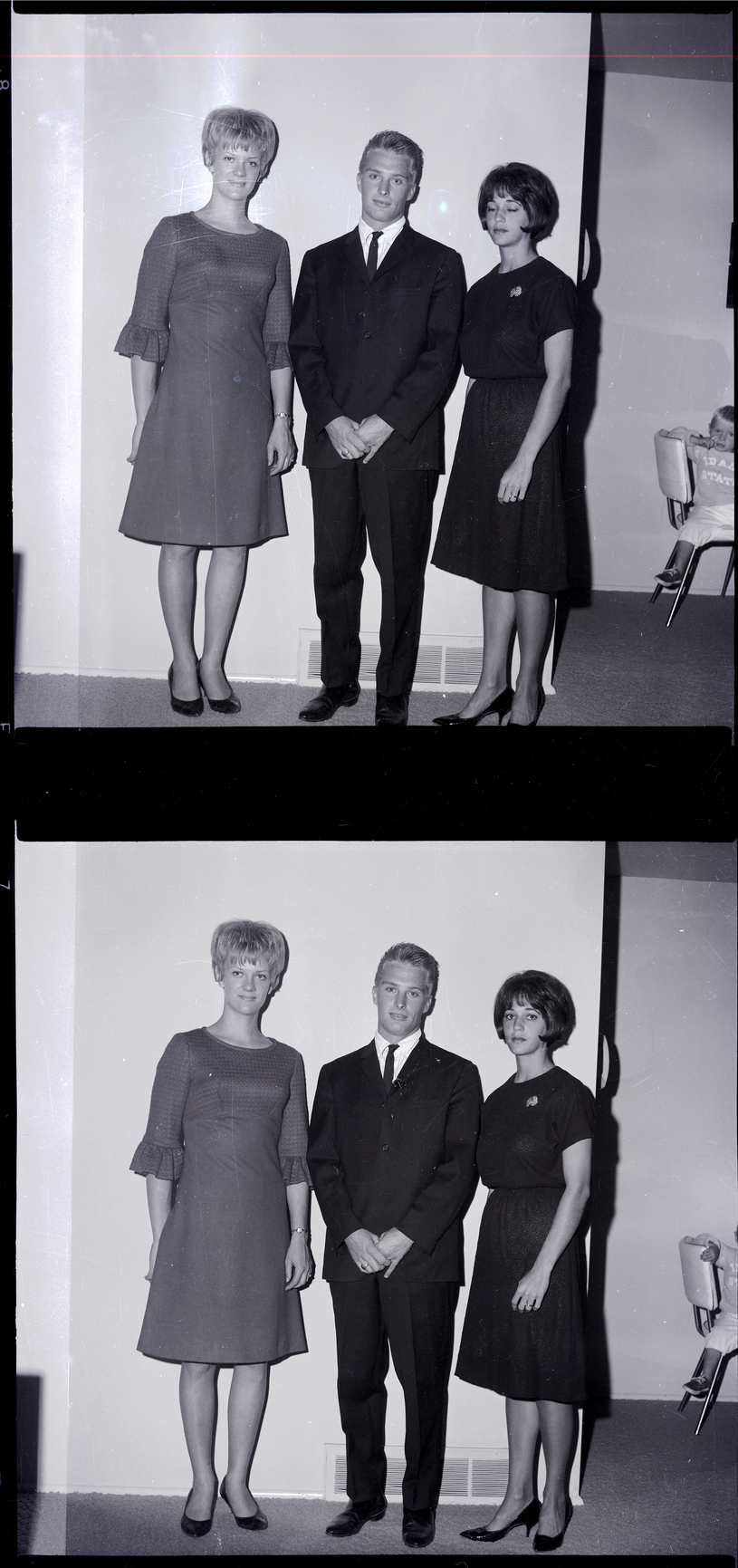 Lita Kincheloe, Michael Tegan, and Nedra Lingnaw. The women are wearing dresses, and the Mr. Tegan is wearing a suit and tie with a striped shirt. In the background, a little boy is a shirt reading "Idaho State" is sitting on a chair.