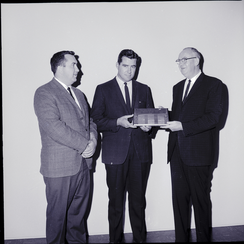 John Wolfe, the 1964 Realtor of the Year, presents James Danner, salesman for the Lynwood Realty Co., a plaque for the 1965 Realtor of the Year award. R. Gene Messersmith, president of the board, stands to the left and watches. All the men are dressed in suits and ties. The plaque reads "Twin Falls Board of Realtors Realtor of the Year Award."