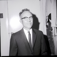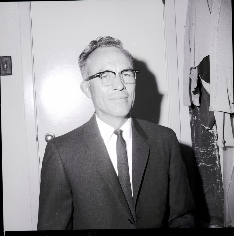 Dr. Leslie Dean, a plant pathologist that developed disease-resistant beans, poses in an office. Some clothing hangs against the wall to the side, and a door and light switch are behind him. He is dressed in a suit and tie.