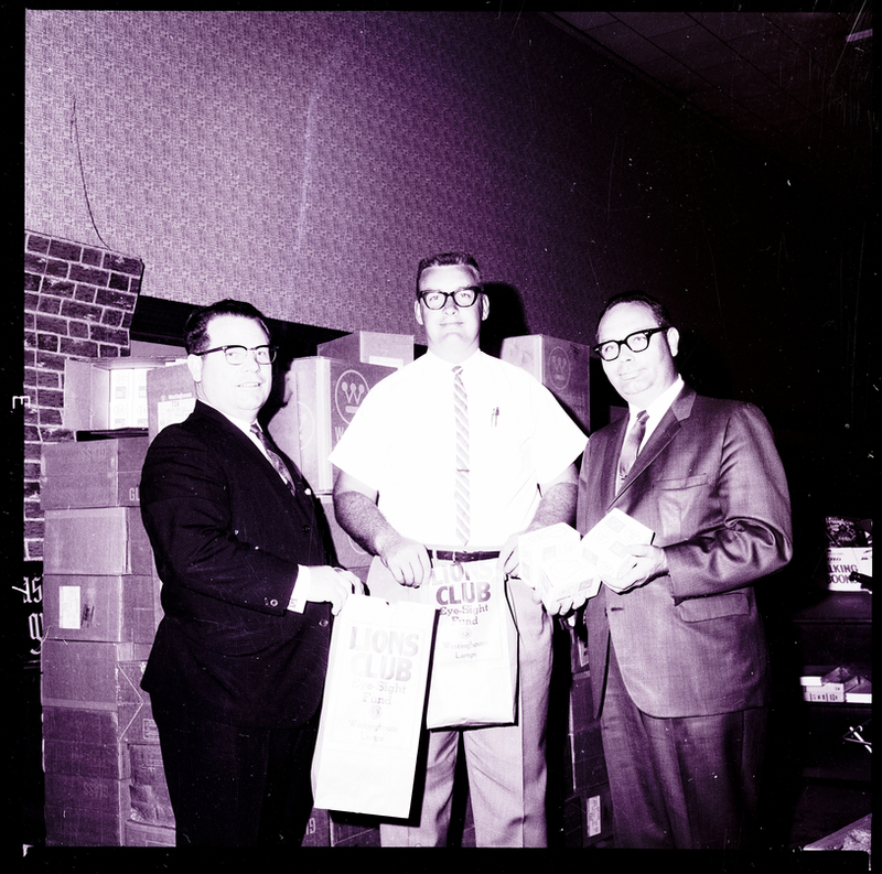 From left to right, Ed Bossard, Jim McCord, and Hugh Coates prepare for a light bulb sale for the Lions International club. The sale's proceeds are to go to the Lion's Eyesight Fund and will pay for glasses for needy people in the Twin Falls area. The bags they hold read "Lions Club Eye-Sight Fund Westinghouse Lamps." Boxes are piled up behind them.
