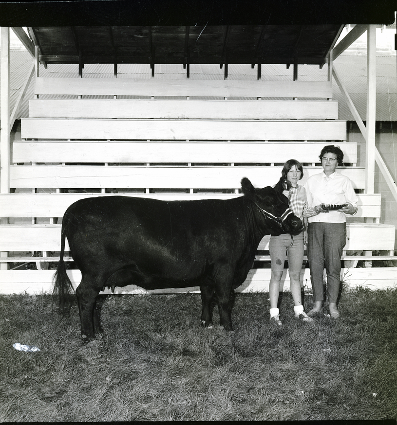 Junior Angus Show Winner, Bonnie Honstead, left, receives an award for her senior yearling. The bowl was presented by Mrs. Samuel Thornton, on behalf of the Western States Angus Association. Bonnie Honstead, wearing a plaid shirt and shorts, holds the bridle for her black Angus cow, in a corral at the Twin Falls County Fairgrounds. Mrs. Thornton stands beside her, holding the award bowl. Some empty bleachers are behind them.