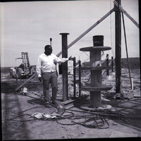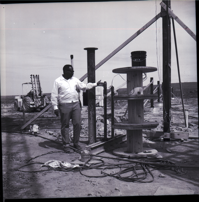 B. C. Hughes, technical director of Project Pre-Schooner II, stands amid the construction at the test site on Bruneau Plateau. He is inspecting some mounted metal pipes. Metal frames are all over the site, and cabling covers the dirt ground. A forklift, shack, and another man are not far away. A plain covered in sagebrush stretches out into the background.