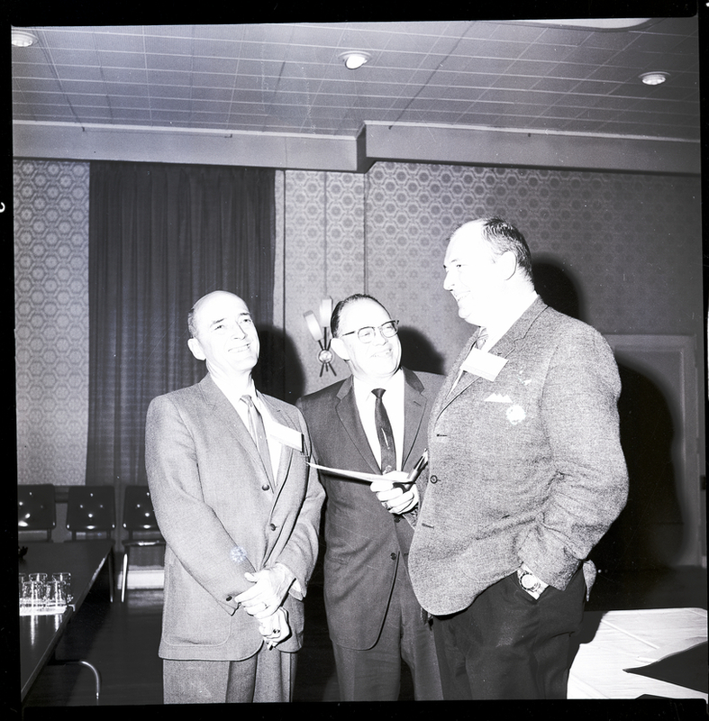Joking before attending the annual state convention of the Idaho Society of Farm and Ranch Managers and Appraisers are, from left to right, Joe Hackney, secretary-treasurer, John Corless, regional vice president, and L. James Koutnik, president of the unit. The two-day convention is being held at the Twin Falls Legion Hall. They are all dressed in suits and ties, and L. James Koutnik holds a paper and a pipe. A table with some glasses is to the side. Some chairs are set up against the back wall.