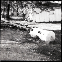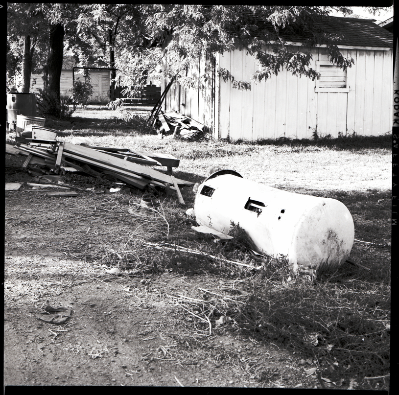 An old tank sitting on a pile of weeds and some planks of broken wood are left out on the edge of a yard. In the background behind the junk are some houses and trees. A cleanup campaign of Twin Falls alleys is planned.